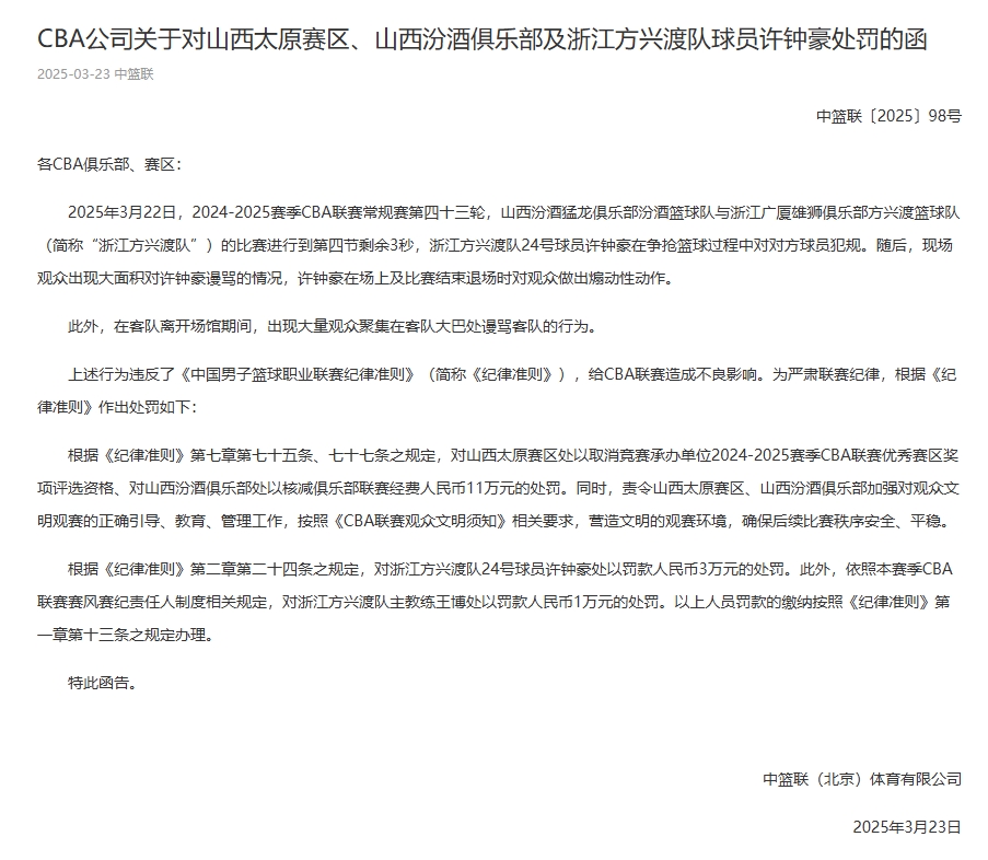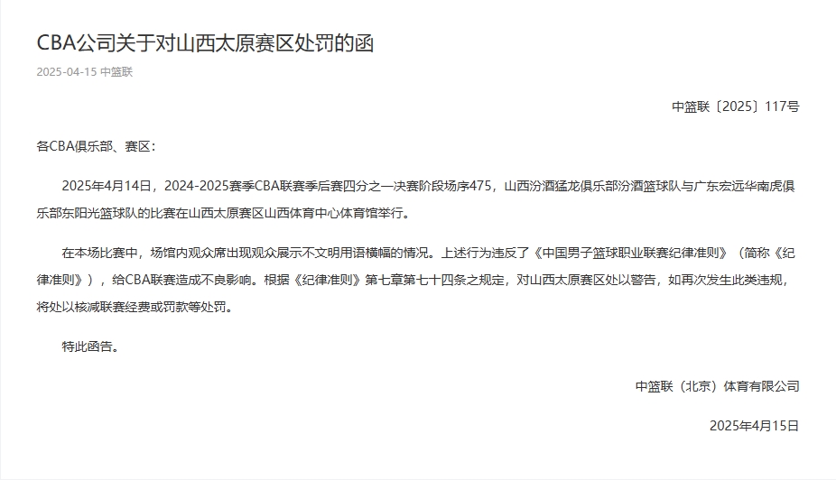 4月18日讯 此前,CBA官方宣布了对此前晋粤大战双方违规行为的罚单,其中,山西赛区和山西俱乐部被严重警告,并核减15万经费。